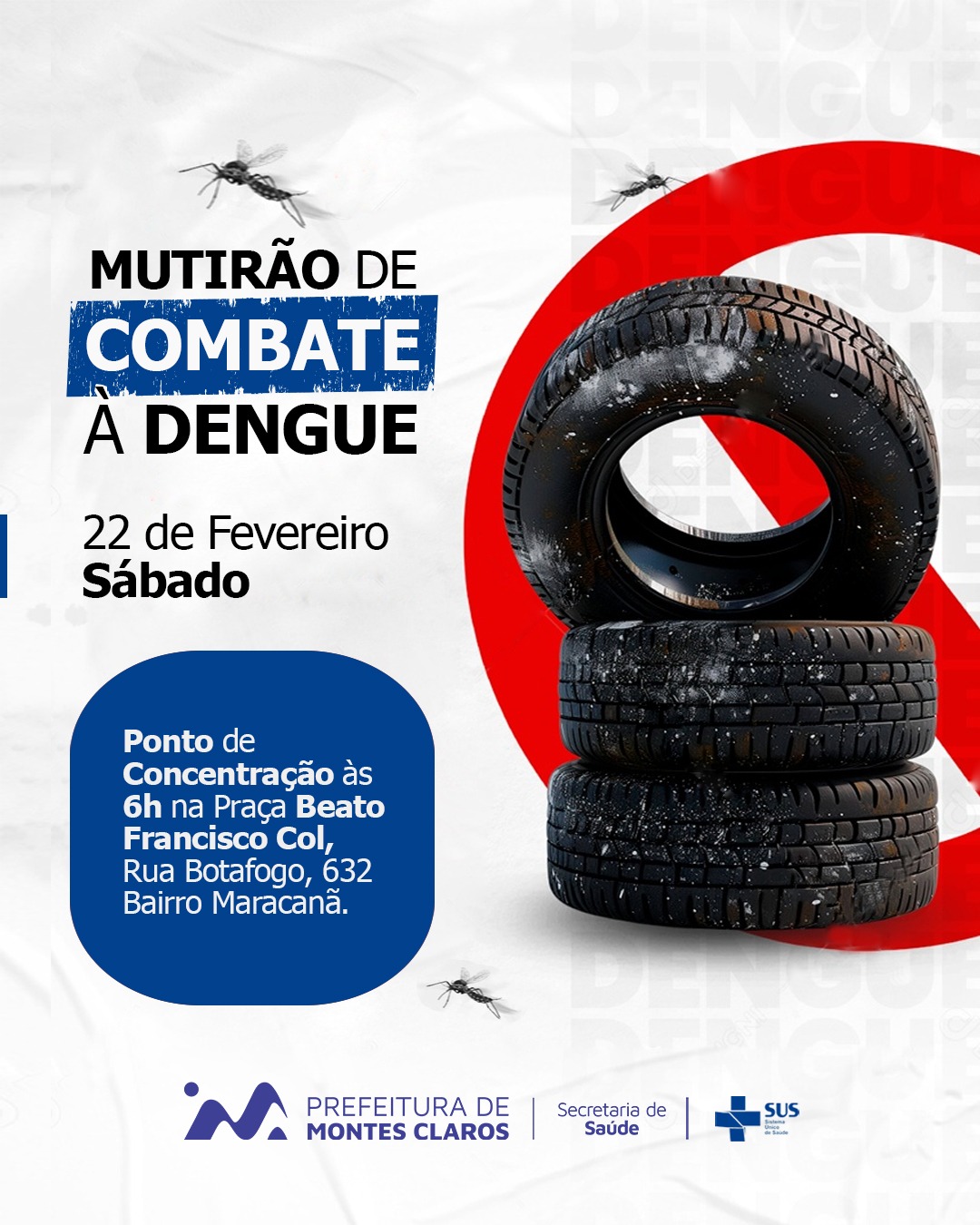A Prefeitura de Montes Claros realiza neste sábado, 22, mais uma ação na guerra contra o mosquito transmissor da dengue, chikungunya e zika. O “Dia D” será realizado na região do Grande Maracanã com o objetivo de recolher inservíveis que podem servir para a proliferação do mosquito.
