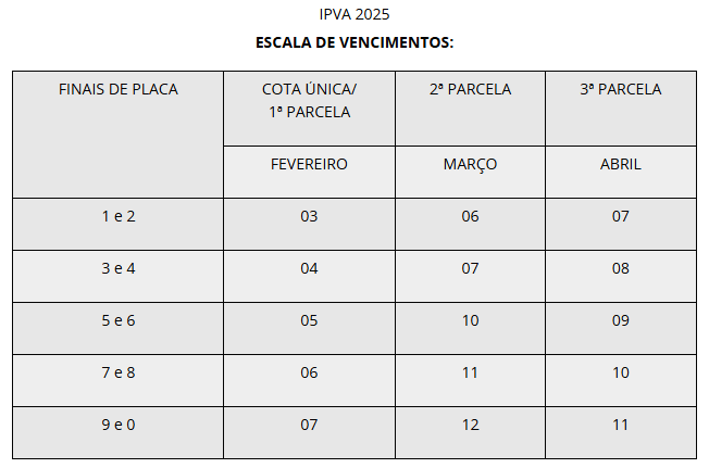 Na sexta-feira, 7 de março, vence a segunda parcela para veículos com placas de final 3 e 4. Na segunda-feira seguinte, dia 10, é a vez das placas que terminam em 5 e 6. Placas com término em 7 e 8 terão o IPVA vencendo dia 11, e 9 e 0, no dia 12.