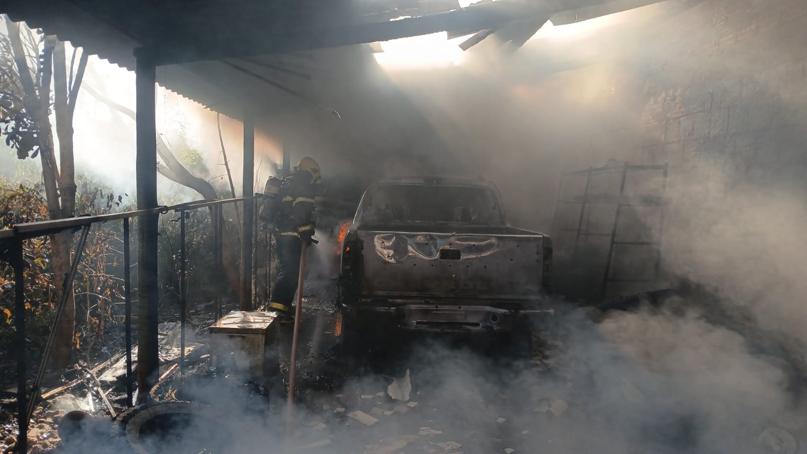 Ao chegarem ao local, os militares se depararam com uma caminhonete Chevrolet S-10 completamente tomada pelas chamas, que geravam intensa fumaça e calor. Após garantir a segurança da área, a equipe iniciou o combate direto ao fogo, utilizando cerca de 1.000 litros de água para extinguir totalmente o incêndio.