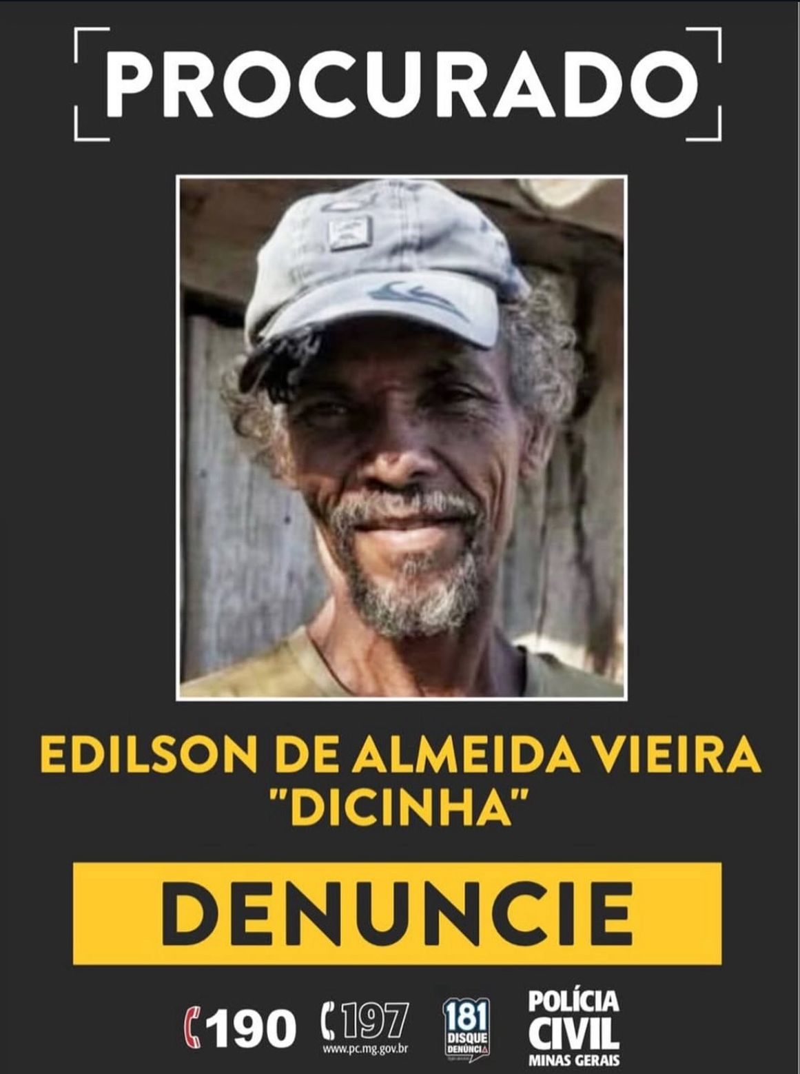 A Polícia Civil de Minas Gerais (PCMG) procura Edilson de Almeida Vieira, de 58 anos, suspeito de matar o próprio primo com golpes de foice e faca no dia 18 de agosto, na Comunidade Vieira, em Pintópolis, no Norte de Minas.
