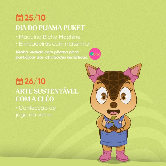 Neste sábado, 25 de outubro, acontece o Dia do Pijama Puket, uma tarde divertida com brincadeiras, massinha e a famosa Bicho Machine. Nessa atividade, a orientação é que a criança venha vestida com seu pijama. Já no domingo, 26, é a vez da oficina Arte com Cléo Criativa, em que as crianças poderão confeccionar um jogo da velha com materiais recicláveis, estimulando a consciência ambiental e a imaginação.