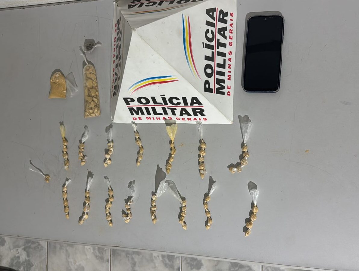 Durante a busca pessoal, os militares localizaram 41 pedras de substância semelhante a cocaína, uma bucha de substância semelhante a maconha e um aparelho celular marca Xiaomi, modelo Redmi 11, de cor preta. Nas proximidades, a cerca de dois metros do local, foram encontradas, atrás de um telhado de amianto, mais 40 pedras de substância análoga a cocaína e duas porções embaladas em saquinhos de chupa-chupa.