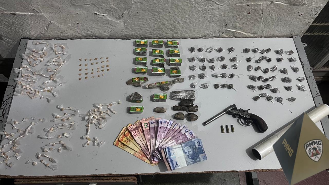 O suspeito foi abordado e submetido à busca pessoal. No bolso da bermuda, foi localizada uma pequena latinha de Mentos contendo 23 pedras de substância com características de crack, além de R$ 199,00 em dinheiro trocado.