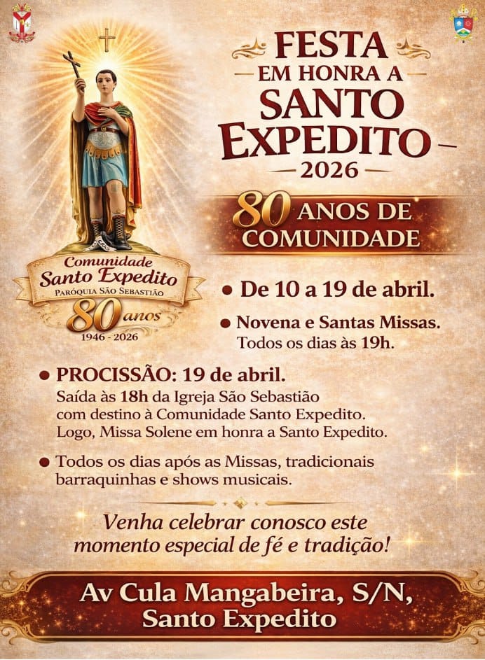 Neste ano, a celebração ganha ainda mais significado com o jubileu de 80 anos. A novena terá como tema “Comunidade Santo Expedito – 80 anos fazendo história para honra e glória do Senhor” e como lema “Jesus Cristo: ontem, hoje e sempre”, resgatando a trajetória da comunidade, seus evangelizadores e a contribuição de gerações de fiéis. “A celebração dos 80 anos representa muito mais do que uma data simbólica. É o reconhecimento de uma história construída pela fé, pelo serviço e pelo envolvimento de toda a comunidade ao longo das gerações”, destaca Pe. Athos Felipe Lopes Soares, Pároco administrador.
