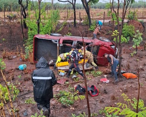 Caminhonete sai da pista durante chuva; Quatro pessoas, incluindo uma criança, são socorridas pelo SAMU.